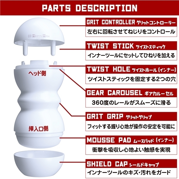右と左のひねる方向で内部構造も変化する!お好みのひねり具合で吸着感をコントロール!挿入口のキャップを外しローションを入れて挿入。