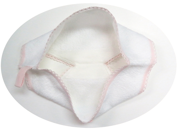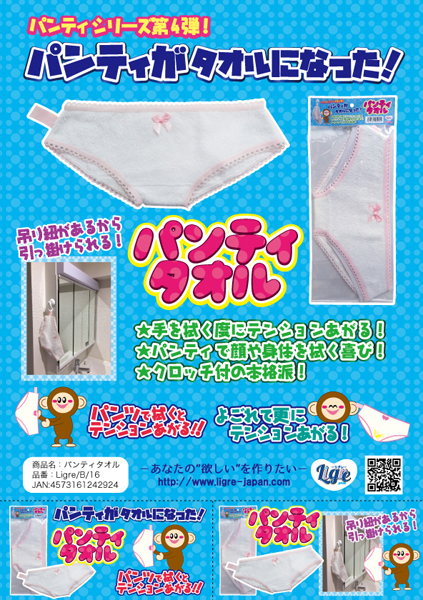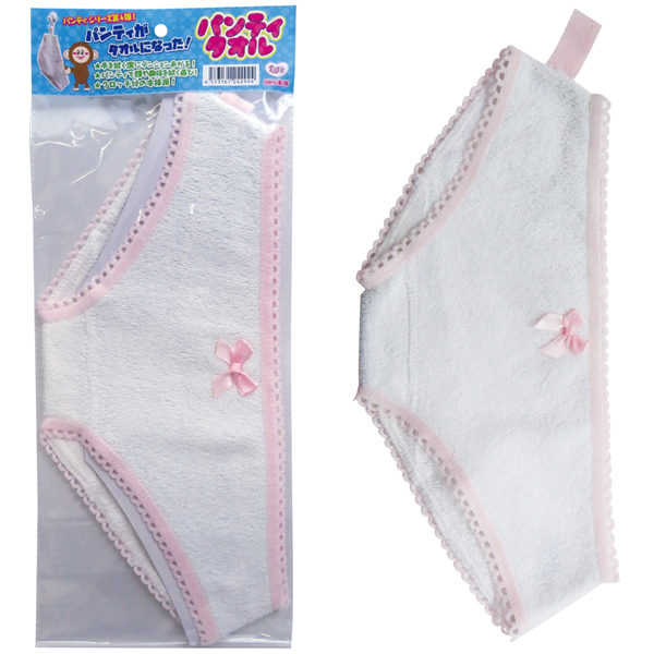 可愛らしいデザインの吊り紐付きタオル!自宅の洗面所に、カバンの中に、いつでもどこでもパンティーで顔や手など身体を拭ける♪使いこむほど味が出るクロッチ付のパンツタオルです。