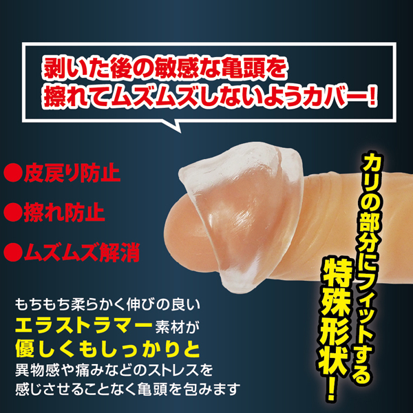 こちらのリングは皮を引っ張り装着することで戻りを抑えるだけでなく、剥いた後の敏感な部分が、パンツやズボンで擦れて気持ち悪くならないようにしっかりカバー。