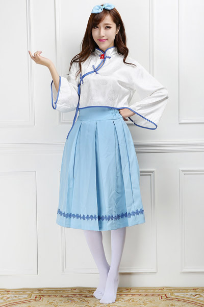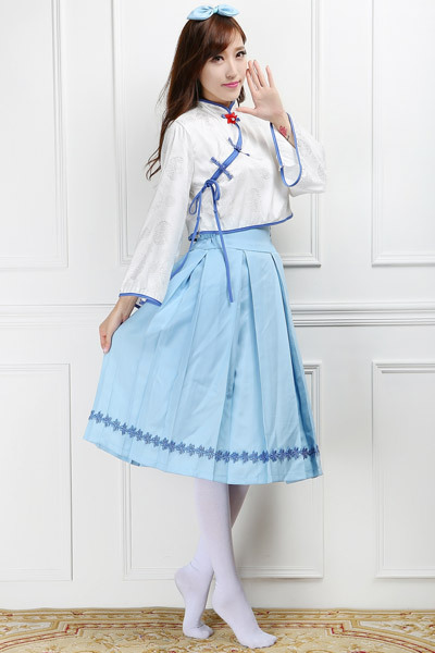 ハロウィンやコスプレイベントには白×青の清楚系な中華風ロリータで!歌うバーチャルアイドルの衣装をモチーフにしたコスチューム♪チャイナ服を彷彿とさせるデザインとツヤっとした白い生地のトップスに、サックスブルーのスカートとリボンがセットになった衣装。