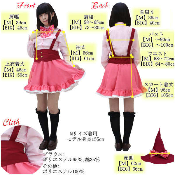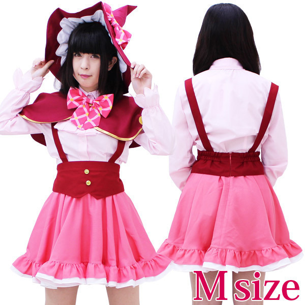 仕様:Mサイズ:B〜90cm・W58〜72cm ブラウス(肩幅39cm、袖丈57〜60cm、着丈58cm、首回り36cm) スカート(丈46cm、肩紐58〜65cm) 帽子:頭囲62cm セット内容:ブラウス(前ボタン・袖口ゴム)、フリルタイ、リボン、肩紐付きスカート、ケープ(前スナップボタン留め)、リボン付き帽子(リボン固定用のスナップボタン付)
