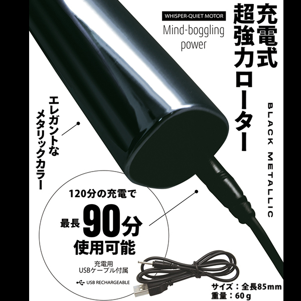 こちらはブラックカラーです♪振動音が小さく10パターンの振動が楽しめて、ボタンもワンプッシュの簡単操作!お風呂でも楽しめる防水仕様で充電式だから超強力なパワーが楽しめる♪充電用USBケーブル付属。