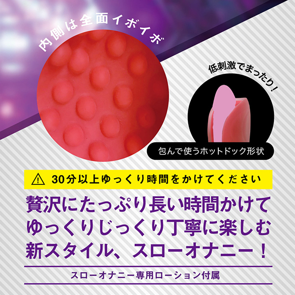 挟み込むホットドッグ形状と、まったり刺激とで、スローオナニーをサポートします。