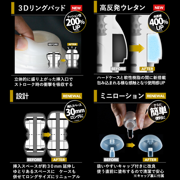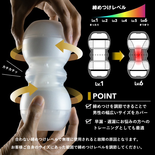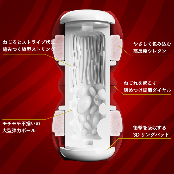 あの「メンズマックス スマート ギア」がフルモデルチェンジで登場。本体の上下を持って回すだけで内部の樹脂に捻れを発生させ、締めつけが調節可能なメンズマックススマートの新提案。締めつけレベルは超ソフトなLv、1から極狭のLv、6までの6段階がお楽しみいただけます。内部構造は大型弾力ボールとねじれば絡みつく縦型ストリング。スマートギア初期モデルにふさわしい王道の構造。上下に挿入口が施されていますので二つの挿入感を楽しめるのが特徴です。
