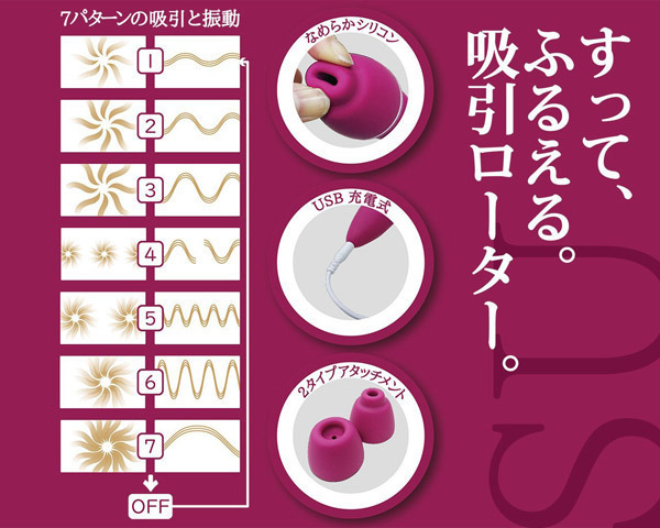 多彩なバリエーションを楽しめる7段階吸引×7段階振動を搭載!USBでの充電約2〜3時間で約2時間使用可能(使用状況、環境により時間が変化する場合がございます)。