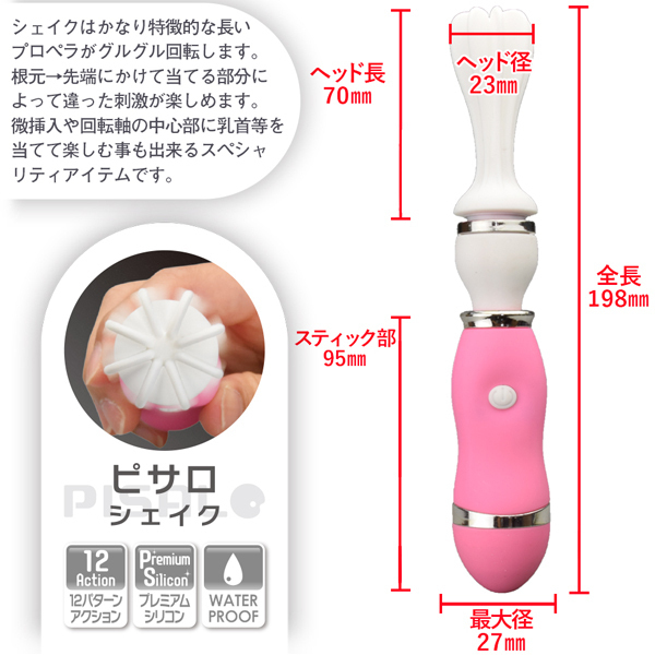ハンドミキサーのような形状が特徴的なアダルトグッズ。長いプロペラ付のヘッド部分がクルクルと回転し敏感部分を刺激♪当てる部位によって異なる刺激をお楽しみいただけます。アクションは12種類搭載!持ち手にはマットラバーを、ヘッドには柔らかな医療用シリコンを採用し長時間のプレイにも対応、メンテナンスしやすい生活防水設計。