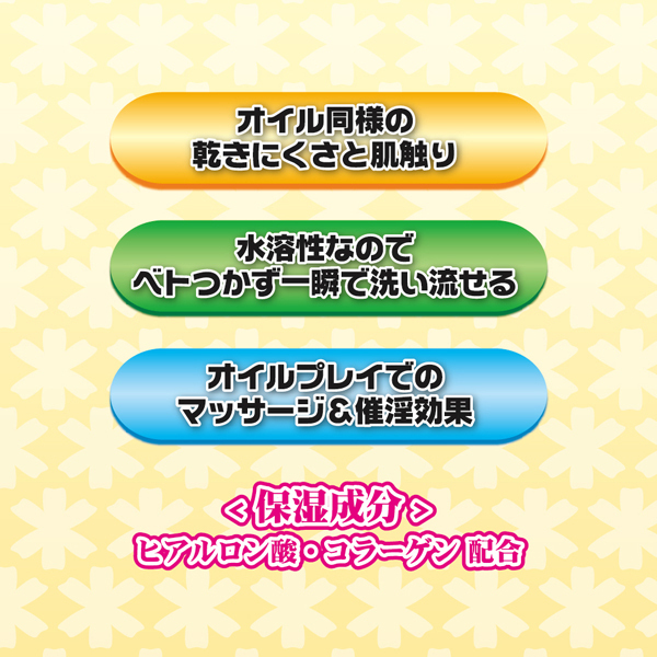 南国チックで官能的な香りが特徴のイランイランを配合した、ベタつき少なくサッと洗い流せる水溶性ローション200ml。高保湿なヒアルロン酸やコラーゲンをたっぷり使用した贅沢仕様!口に入っても大丈夫な成分を使っているためオーラルプレイもOK◎オイルのような質感で乾きにくく長時間のマッサージでも大活躍♪