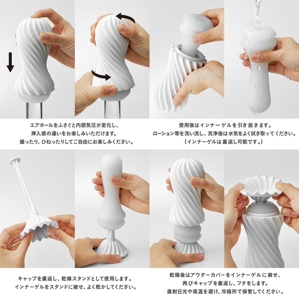 ツイスト状ケース底面の空気穴を塞ぐと、内部気圧が変化しバキュームが発生!その状態でピストンすると連動してケースが回転するという斬新ギミックを搭載!さらに、雑巾を絞るように直接ケースを捻れば、絡みつくような摩擦刺激も体感できます。