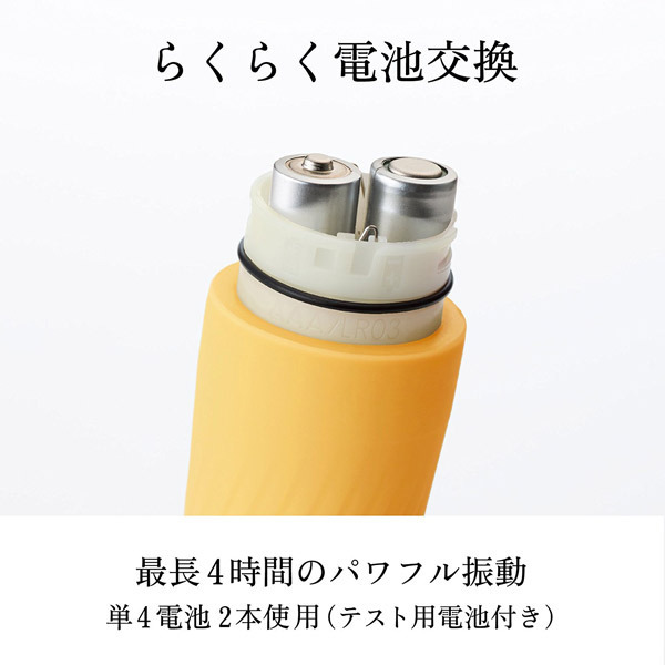 最長4時間のパワフル振動、単四電池×2本(テスト用電池)付属。