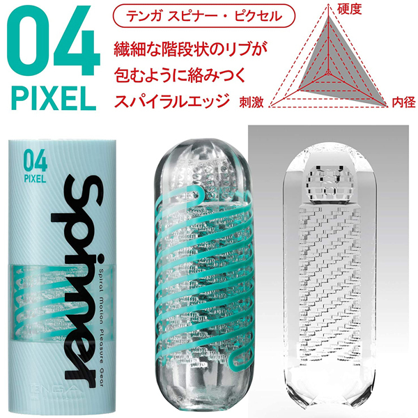 ストロークに応じて捻りが加わるテンガスピナーに、捻りが強化された次世代スピンギミックが楽しめる新作が仲間入り!04ピクセルは、螺旋状に配置されたリブが全体を包み込みながら刺激するスパイラル構造。