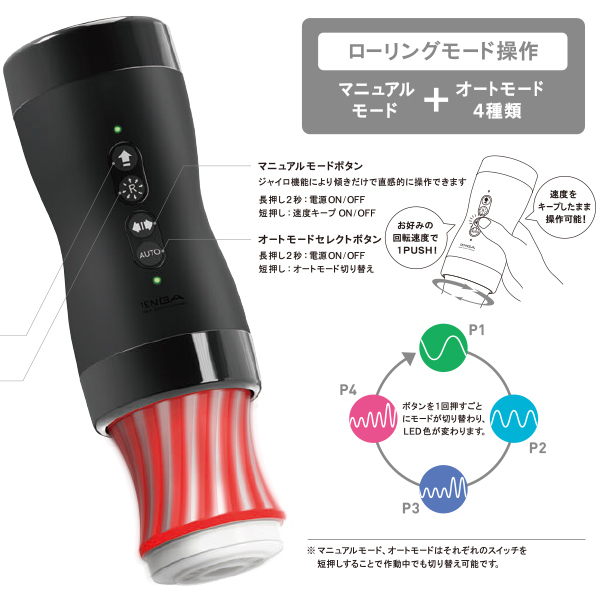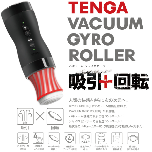 TENGAカップ用電動コントローラ「GYRO ROLLER」に強力バキューム機能を追加!4種類のリズム吸引×4種類の回転で刺激する「バキュームジャイロローラー」。ジャイロセンサー搭載!手を傾けるだけで自在にコントロールできる新感覚のテンガ体験をお楽しみください。150分間充電で約60分連続稼働可能!回転刺激を追求して設計されたローリングテンガシリーズ推奨