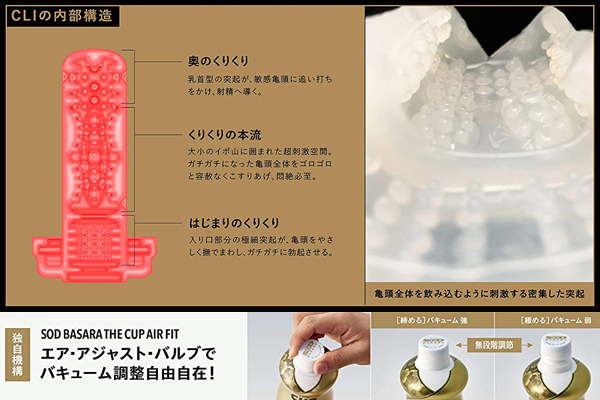 新機構エアアジャストバルブを搭載!「SOD BASARA」シリーズ最新作の簡易オナホ「CLI(クリ)」。無数の粒突起が全体をこねくり回すように責め立てる突起特化型構造!ビリリと痺れるような快感がクセになる非貫通オナホ。先端のキャップを開閉することで自分好みの圧力や挿入感を味わえます◎重さ156g、ロイヤルウレタン製