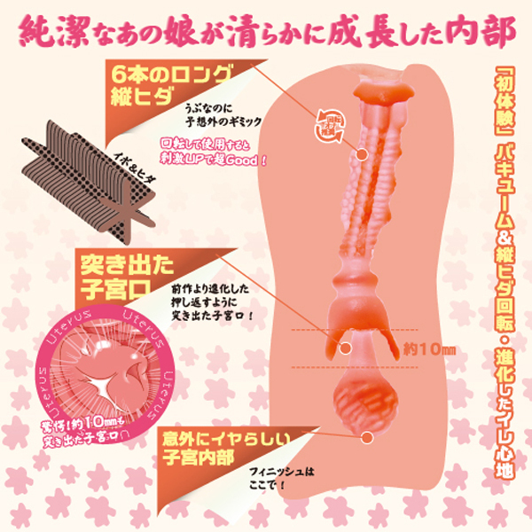 純潔感がさらに進化した!!純潔なあの娘が清らかに成長した内部処女膜ギミックと突き出た子宮口は今作も健在!新形状で新たな快感そしてバキューム力アップ&超絶ギミック縦ヒダ回転!ぷりぷりのもち肌感触、ばーじんスキン!安心・安全の国内生産で素材臭と油っぽさを抑えました
