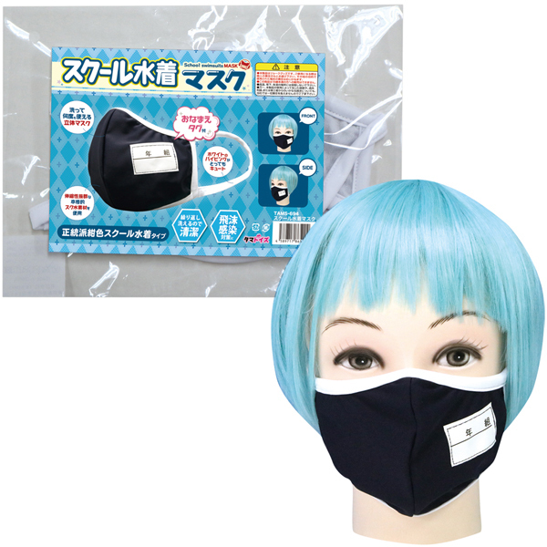 ゼッケン入りの本格派仕様!伸縮性に優れたネイビーのスク水素材に白パイピングを施した正統派スクール水着風のユニークな立体マスク。