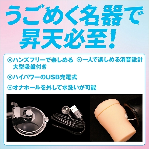 うごめく名器で昇天必死!ハンズフリーで楽しめる大型吸盤付き、ハイパワーのUSB充電式、オナホールを外して水洗いが可能、超強力大型モーター搭載、一人で楽しめる消音設計、膣の奥がうねうねと動き絡みつく、締り抜群の肉厚な膣壁はゾリゾリと搾り取られるような感覚で細かい振動が敏感部分を刺激する。