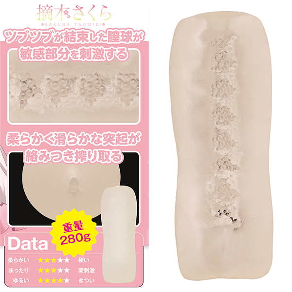 タマトイズの専属Vtuber「摘木さくら」との公式コラボ商品です♪中型サイズの非貫通オナホで、使いやすさと心地よさを兼ね備えています!内部にはツブツブが結束した膣球構造があり、滑らかな突起がしっかり絡みつき、程よい刺激を生み出します♪プニプニとした柔らか素材を採用しているので、根元まで優しく包み込む設計です!280gの適度な重量で、手にフィットするサイズ感もポイント♪開封後すぐに使えるよう、ローションも付属しています!イラストは樋上いたるが手掛け、こだわりのデザインが魅力です♪