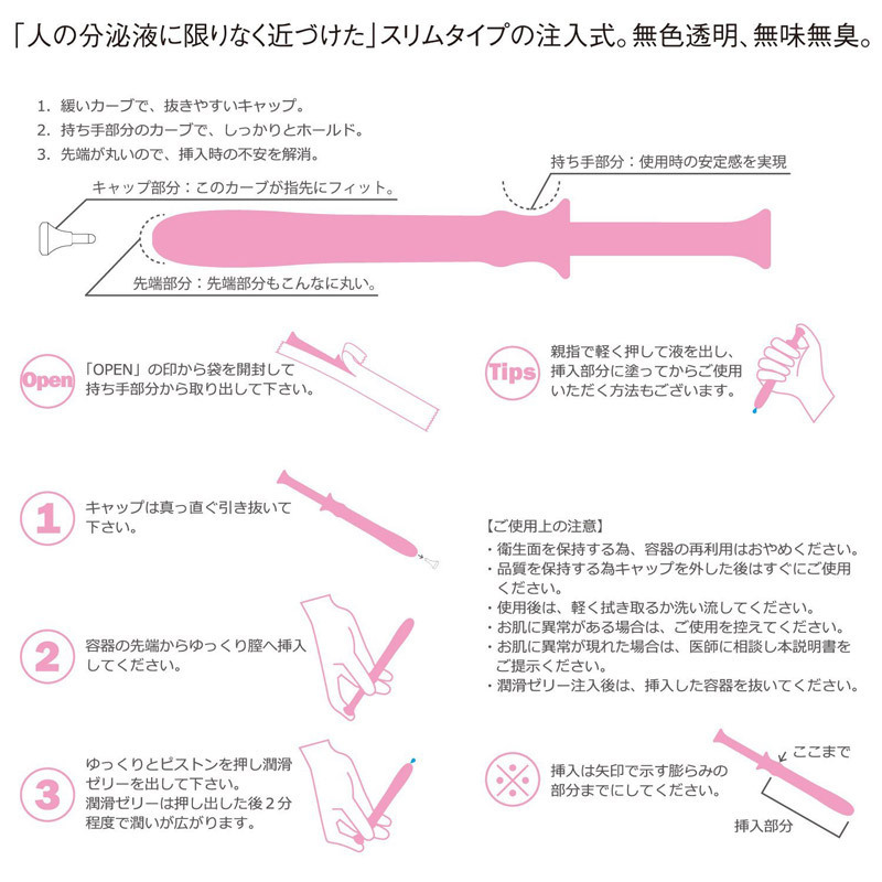 注射器型のノズルで内部に注入できるから衛生的!ヒアルロン酸などを配合した分泌液に近いとろけるゼリーで、最後までパートナーにバレる心配はありません。