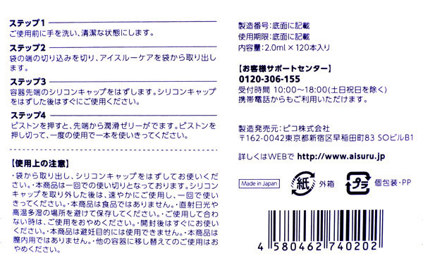 ●ワンタッチで注入できる注射器タイプ●一回使い切りの個包装で衛生的●自然に潤う無香料・無着色●身体にやさしい成分を配合した弱酸性。