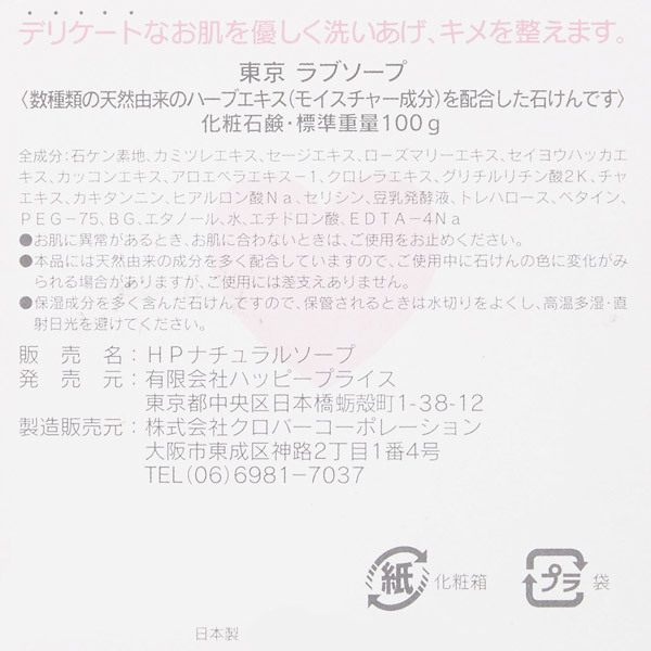 血液や脂などのタンパク系汚れには弱アルカリ性の優しい石鹸でしっとりOFFが正解!東京ラブソープはカミツレやローズマリーなどの植物エキスもたっぷり配合、肌を優しくケアしながら美肌へと導きます。