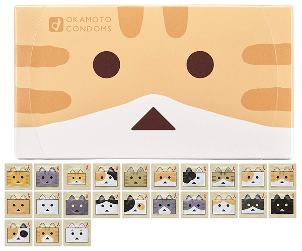 オカモトとニャンボーのコラボレーションコンドーム♪個包装もかわいいニャンボー柄(全23種)ねこの温もりあったかニャンコゼリー採用。ゼリーたっぷりタイプでお得な3個パックです。