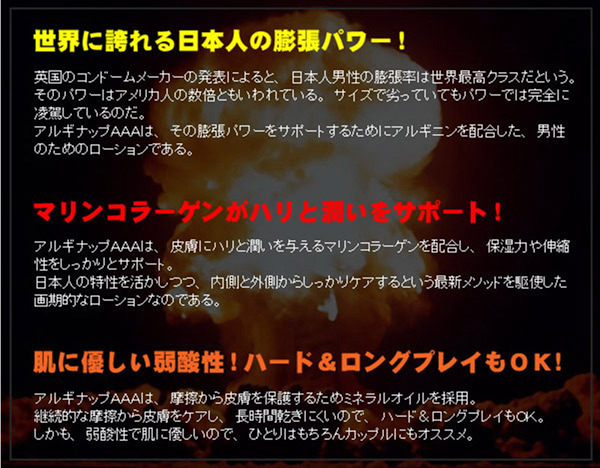 男性用マッサージローション「アルギナップAAA (ノーマル)」マリンコラーゲンも配合した弱酸性なので、肌への負担も少ないです。