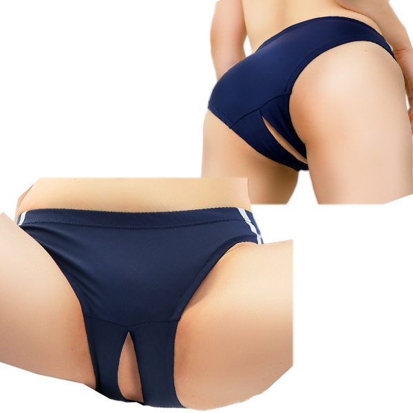 日本国内の工場で縫製され、国産のマイクロファイバー生地を使用した穴あきタイプのブルマ。穴の両サイドが重なるように縫製しており、正面からは穴が見えにくいシルエットになります。