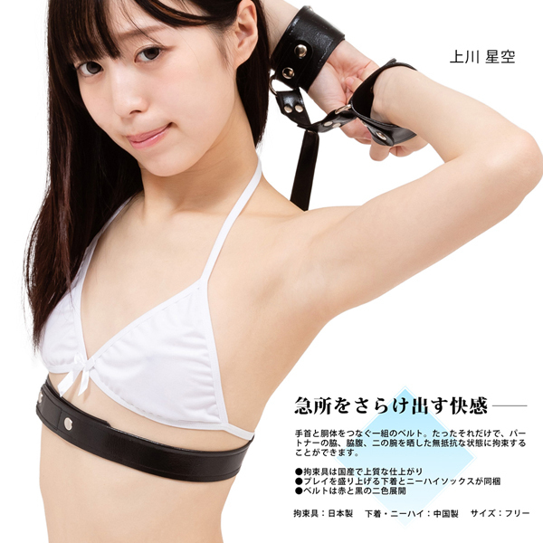 手首と胴体を一組のベルトで繋ぎ止め、ワキだけでなく、わき腹や二の腕までを晒し無抵抗な状態で動きを制限!ベルトは高品質な日本製で、手軽に使えるマジックテープ式♪他にもブラ、紐パン、ニーハイ付属!パッケージの元AV女優「上川星空」さんと同じように完成します。