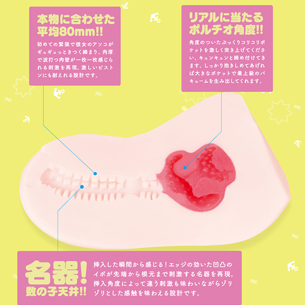 まるで本物のようなリアルなポケットとリアルな湾曲!エッジの効いたゾリ感が楽しめて、最奥部分ではコリコリとした疑似子宮が尿道を刺激しながら爆発的な射精感を促してくれます♪本物に近づけた平均サイズにGスポットとAスポット、リアルに当たるポルチオ角度、波打つ肉壁と随所に拘った内部構造は肉厚感も十分!非貫通ならではのバキュームと吸い付き、挿入した瞬間から感じるエッジの効いた凹凸のイボ。