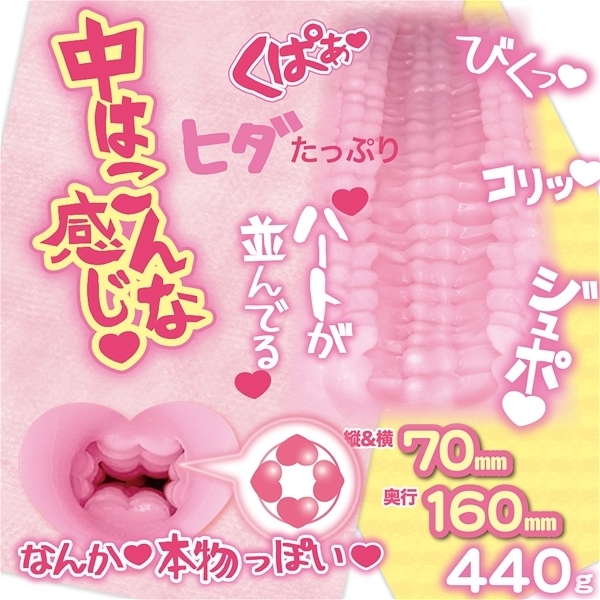 ココロとつながる気持ちよさ、ハートをモチーフにしてみたら思った以上にアレっぽい、コリコリとこすこすが良い感じ、ずっしり包み込む440グラム。貫通型で思う存分ジュポジュポを体感してください。