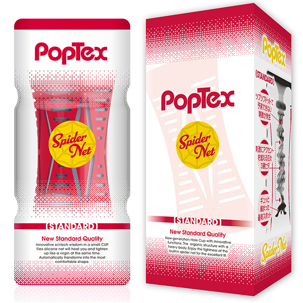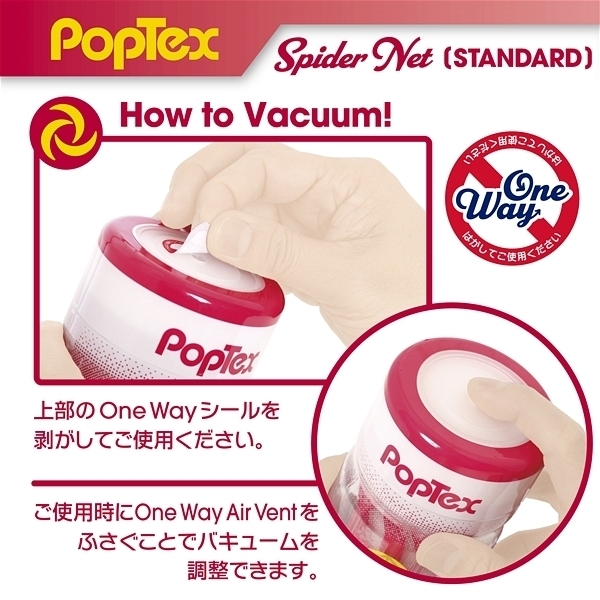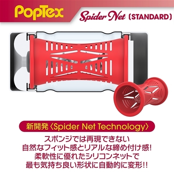 ポップテックススパイダーネットカップスタンダード<リアルな締め付け×ネットヒダ刺激の高機能カップホール>新開発SpiderNetTechnology搭載型カップホール!ホールを包み込む柔軟性に優れたシリコンネットで最も気持ち良い形状に自動的に変形することでスポンジでは再現できない自然なフィット感とリアルな締め付け感を実現しました!内部構造は網目状のネットヒダの中心にアクセントのイボ刺激のアクセント!強力に吸い付く最奥のバキュームスポットは天面の「OneWay」シールを剥がし空気を抜いて挿入することで内部のまとわりつき感をより楽しむことが出来ます。
