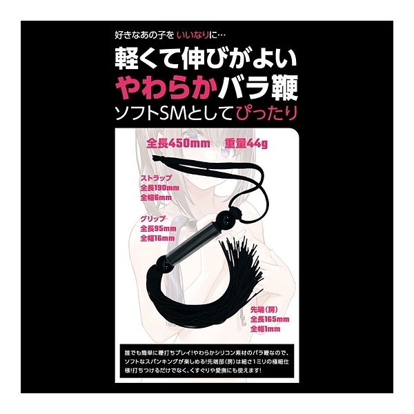 SMプレイの代名詞、SM専用バラ鞭「SMシリコンバラ鞭」!ビシッバシッと叩く音が響き渡る、SMプレイでは欠かせない「鞭責め」をお手軽に始められるSMアイテムです。