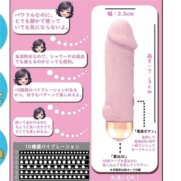 パワフルなのにとても静かで使っていても気にならない。生活防水なのでシャワーでも使える。10種類のバイブレーションで楽しめる。肌触りが気持ちよく、小さいボディでパワー抜群!●カラー:ピンク