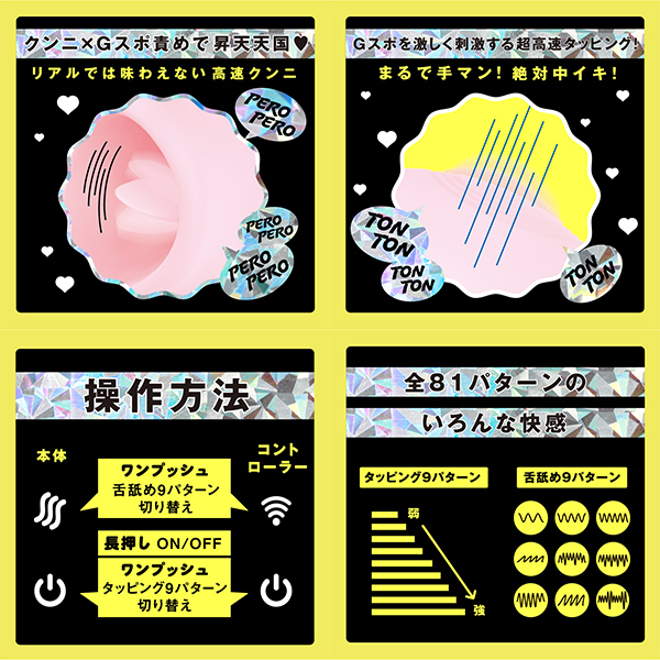 Gスポ覚醒!高速タッピング!超!愛を感じる舐め×手マンバイブ!トントンとGスポを刺激する高速タッピング機能はまるで手マンされているかのような極上快感!スベスベの舌で舐め上げるクンニはリアルでは味わえない超高速舌技!クンニ×Gスポ責めでたまらない快感_遠隔操作コントローラー付きなので、手放しでも楽しめます!中イキ開発にもオススメです_敏感な部分に直接触れるものだから、ぷにっとソフトな素材を使用しました。