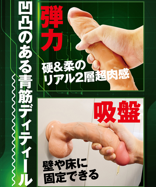 内蔵された硬芯を、握ると生体感のある柔らかな皮で包み込んだ二層構造!徹底された肉感弾力は使用面ほかリアルさを更に加速させ、男根のように生々しい見た目で貴方の性欲を思う存分満たします。