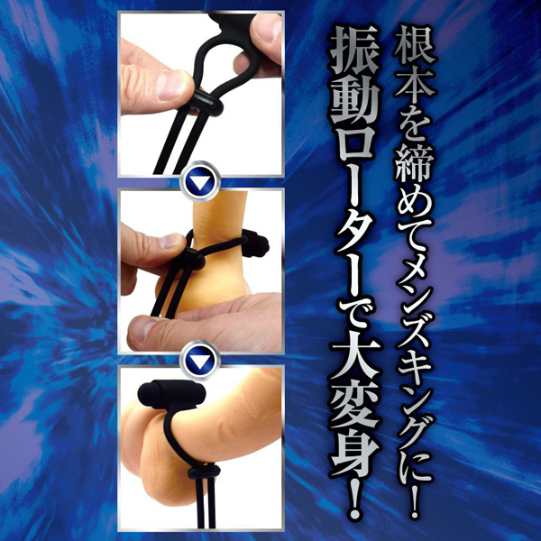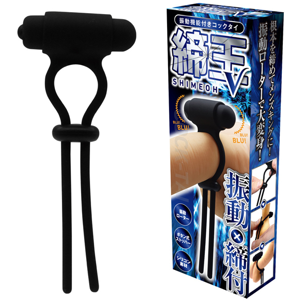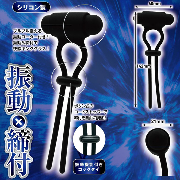 根本を締めてメンズキングに!快感キングクラスのコックタイ、「締王」!根本に巻きつけて、ネクタイのようキュッと締めれば、まるで王者のような貫禄に大変身!締め付け部分のコードストッパーは、自由に調整できるボタン式!本体素材は、肌触りがよいシリコン製!締め付ければ、もう貴男はまさにメンズキング!タイプ「V」は、「VIBRATION」の「V」!ブルブル震えるローターが組み込まれた、振動機能付きのコックタイです。