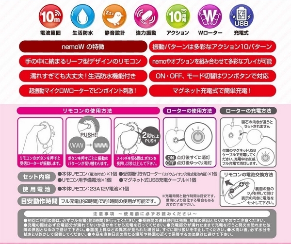 仕様:パッケージ:18.0×12.0×3.7cm 本体:ローター5.3×2.5cm・リモコン6.7×4.1×1.9cm 電池:本体USB充電式、リモコン23A12V電池×1本使用(予備電池1本付属)