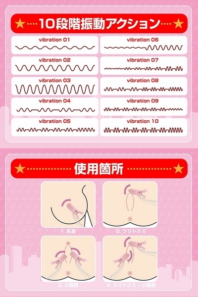 クリや乳首、小陰唇などお好きな部位を挟むことでピンポイントに刺激!10段階もの豊富な震動アクションを搭載しており、チクニー好きさんや、クリ責め好きさんにはたまらない商品となっています。